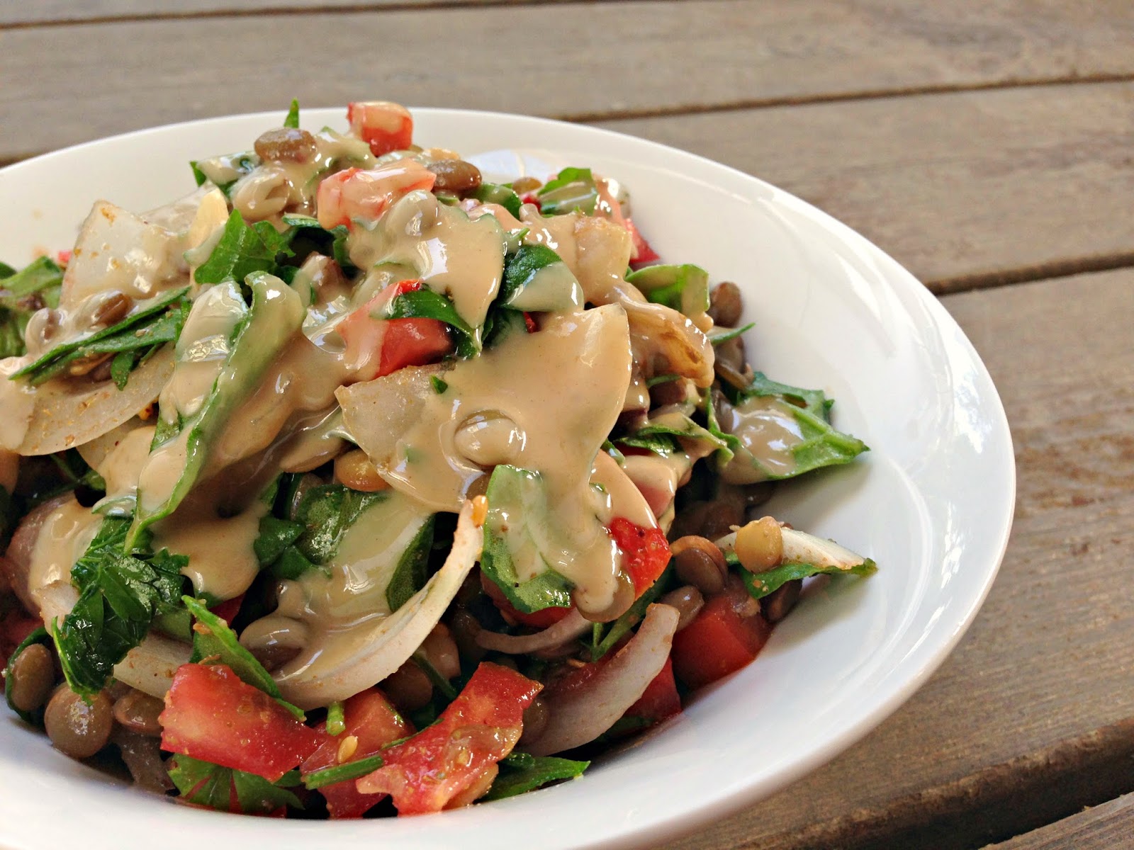 - מגישים עם טחינה גולמית על הסלט ולחם טרי בצד