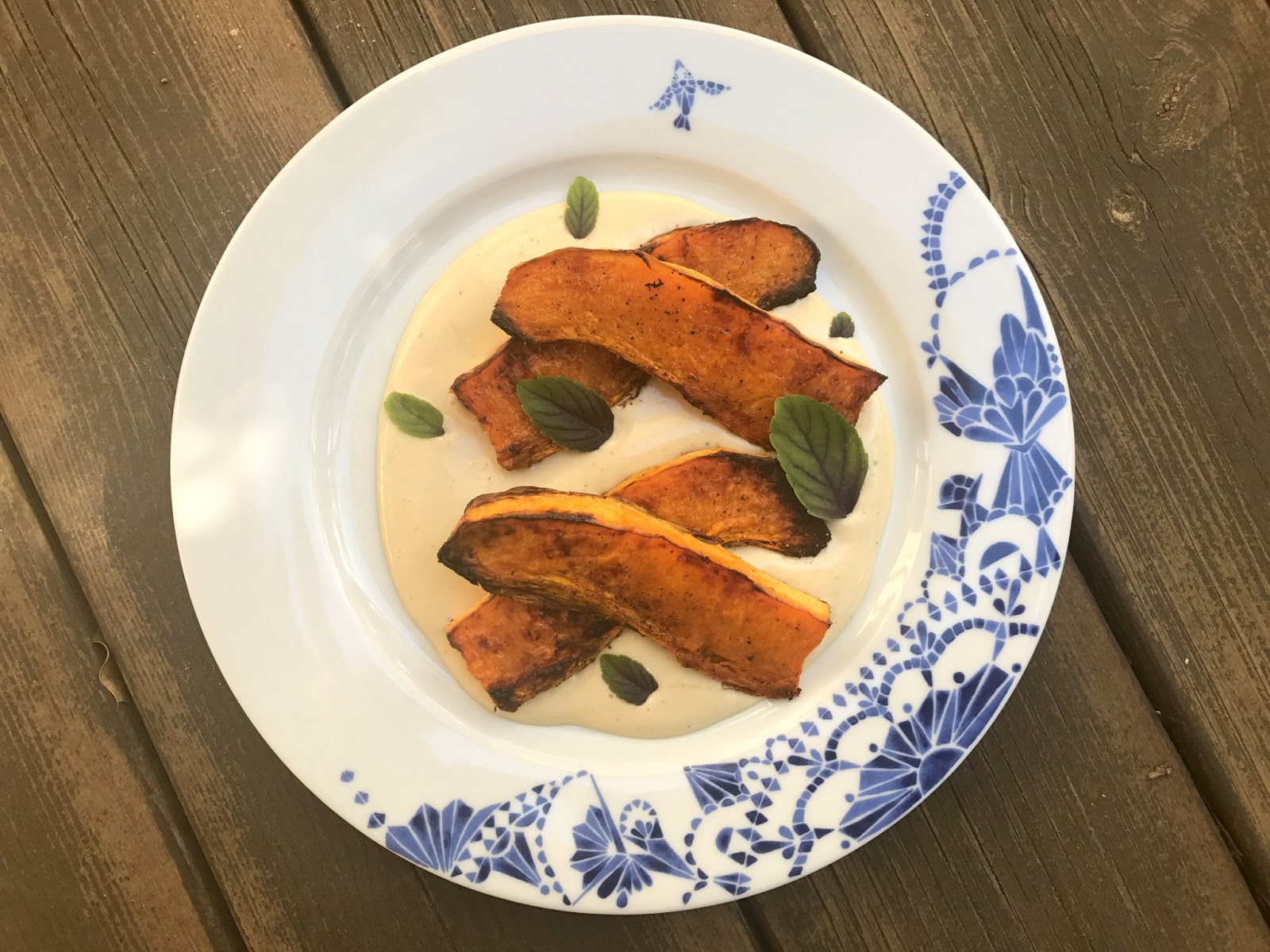המתכון השני שהכנתי לכם הוא מתכון מגזרת האנטי-פסטי, הוא מגניב כמנה ראשונה, מנת ביניים או תוספת. במתכון הזה השתמשתי בחצי מהחלק העליון של הדלורית. קילפתי וחתכתי לאורך לשמונה סלייסים שמנמנים. הכמות הזו מספיקה לשתי מנות גדולות או ארבע מנות פתיחה. הסלייסים ישמרו במקרר (ללא הטחינה) כחמישה ימים.